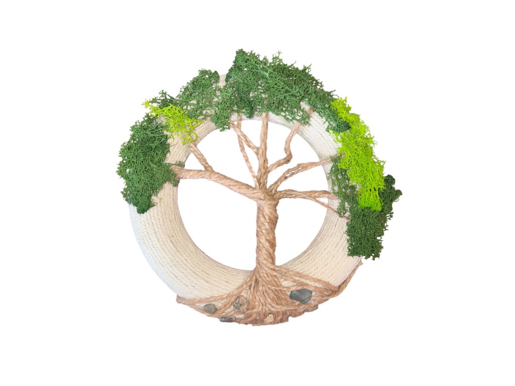 Věnec je vyroben technikou lepení z kombinace přírodních materiálů, které dodávají dekoraci přirozený a harmonický vzhled. Listy stromu jsou doplněny umělým mechem, který podtrhuje přírodní charakter celého věnce a zároveň zajišťuje jeho dlouhou životnost.